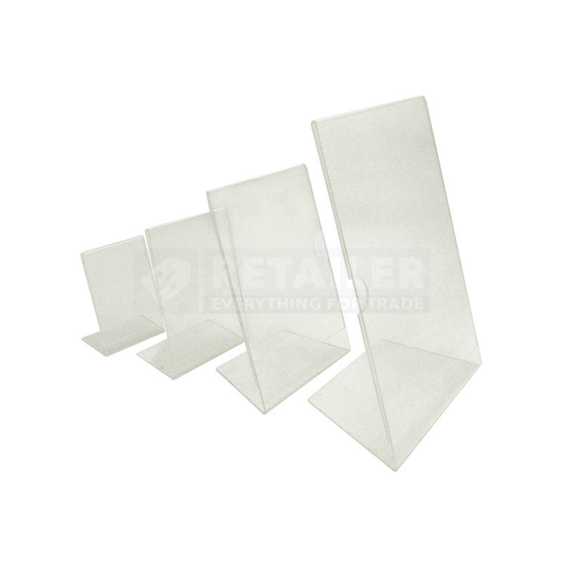 L-ფორმის 2მმ. აკრილის სტენდი-სადგამი გამოირჩევა სპეციალური ჭრილით, რაც შიგთავსის მარტივად შესაცვლელად გამოიყენება.
