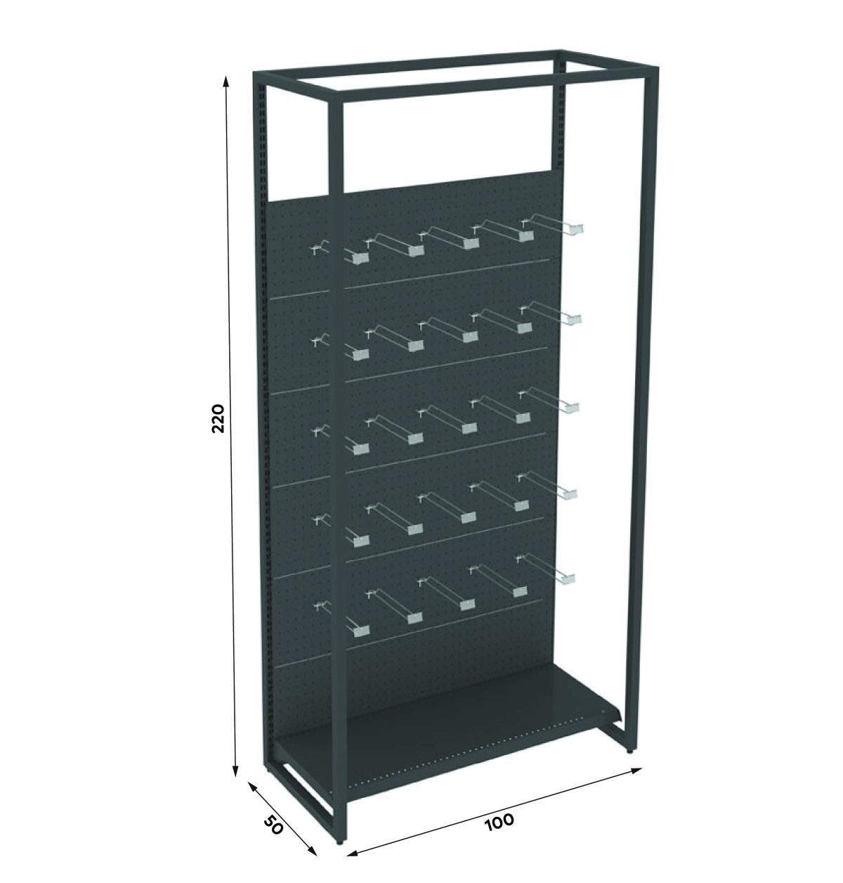 სტელაჟს აქვს პერფორირებული პანელი, რაზეც მაგრდება კაუჭები (შტირი).